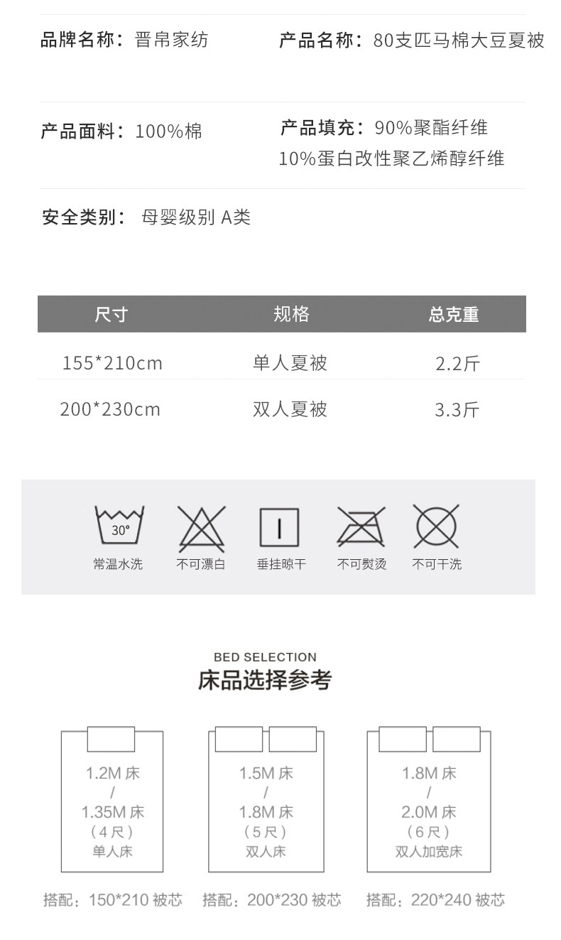 晋帛家纺80支全棉大豆夏被空调被可水洗单双人夏天抗菌薄被芯被子 ¥300.00 0人关注