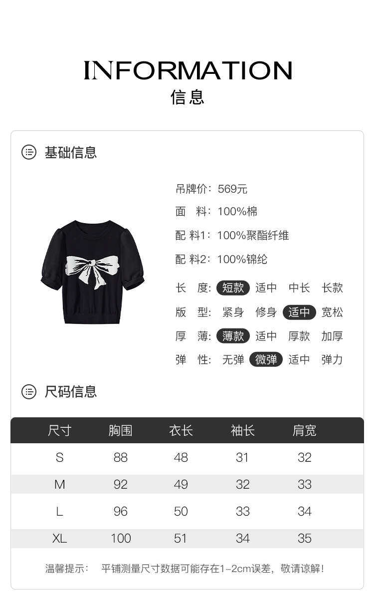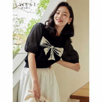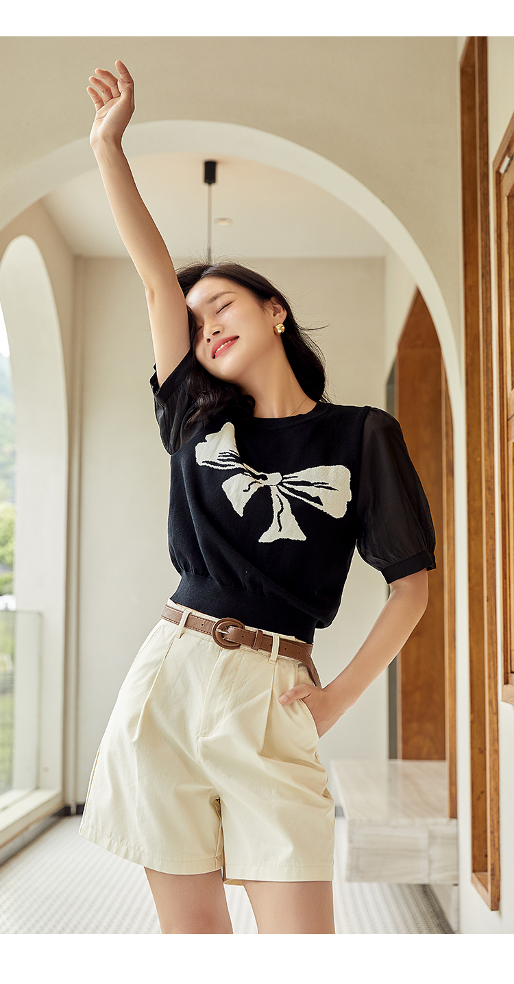 朗文斯汀短袖针织衫女薄款夏装新款蝴蝶结拼接圆领套头洋气上衣 ¥189.00 热销0件